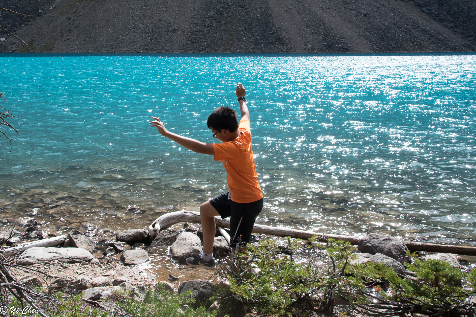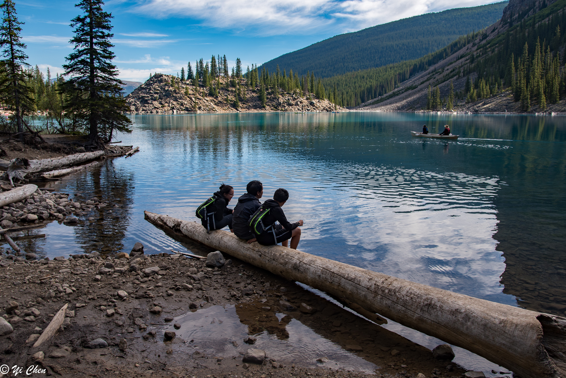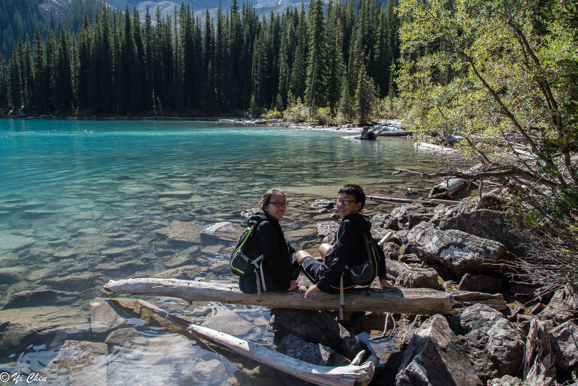 One can never see enough of the lake, it seemed every minute it had a new look. Nonetheless, we had to move on. The trail from Lodge to inlet on the west shore of the lake was a very easy stroll, and it offered many different views of the lake. There were areas we could get to the water, there were also plenty of rocks and logs to sit on and watch the lake’s ever changing beauty and the rugged summits of the first 5 of the Ten Peaks. Peak #1 was the most impressive, with its summit glacier.