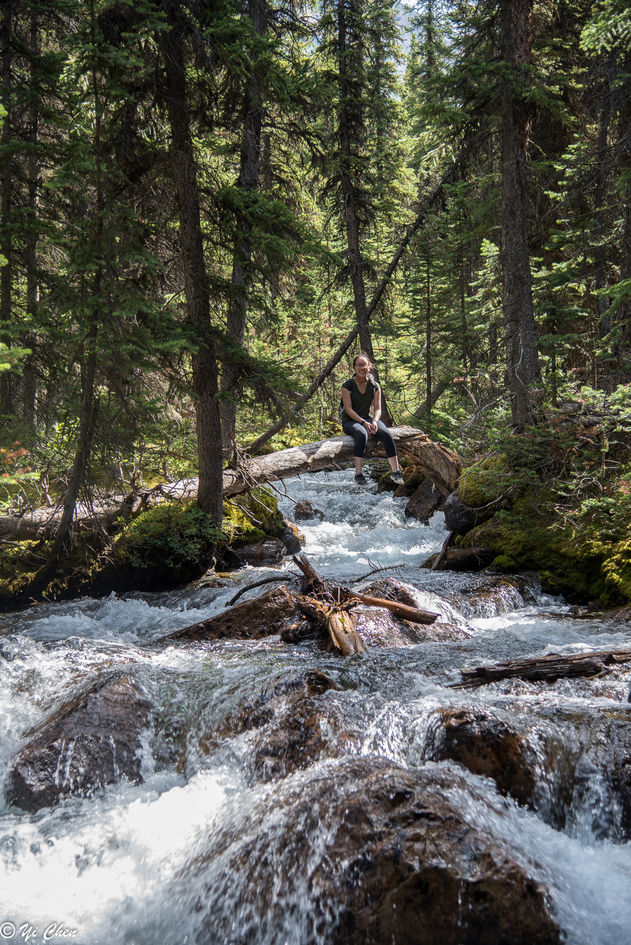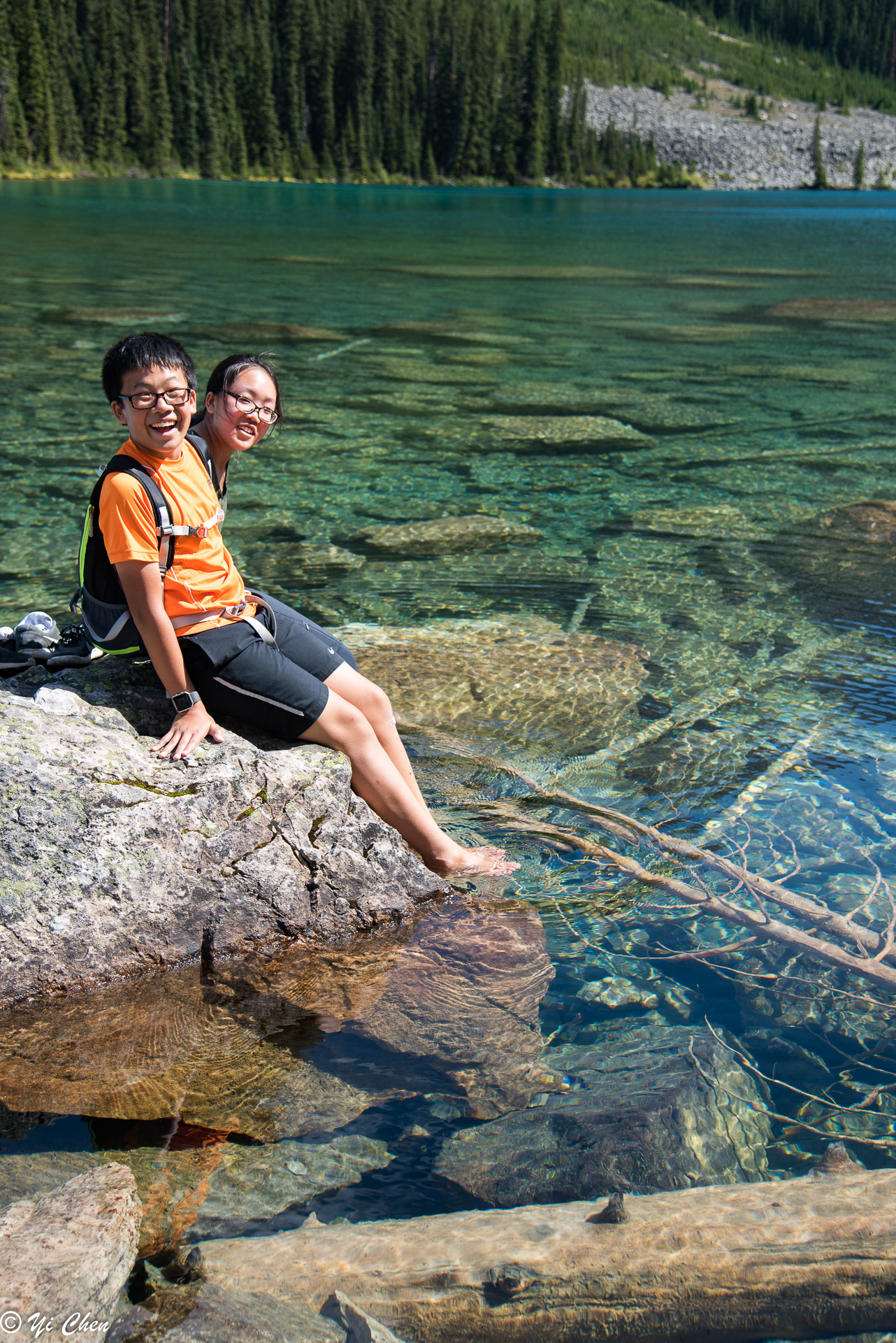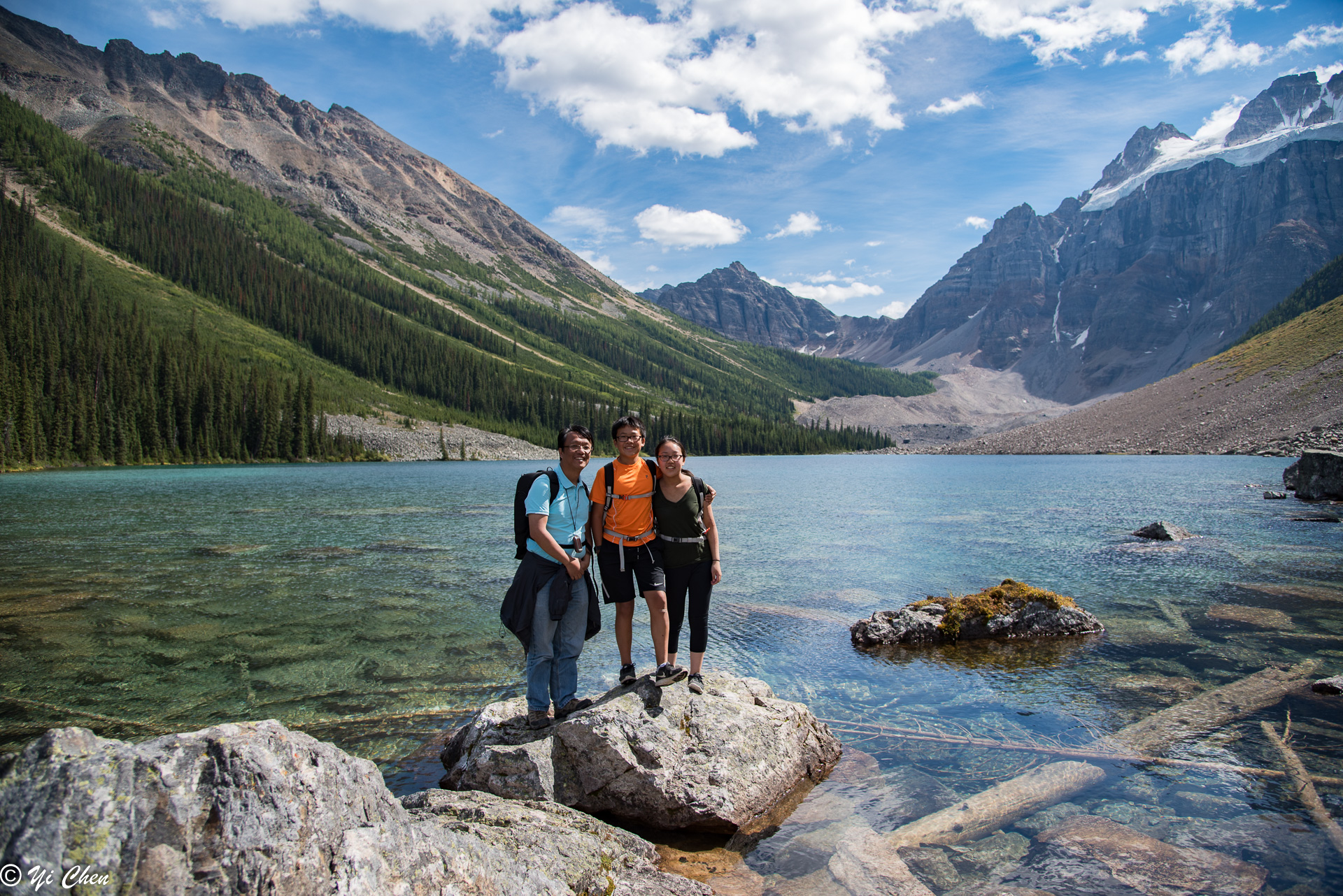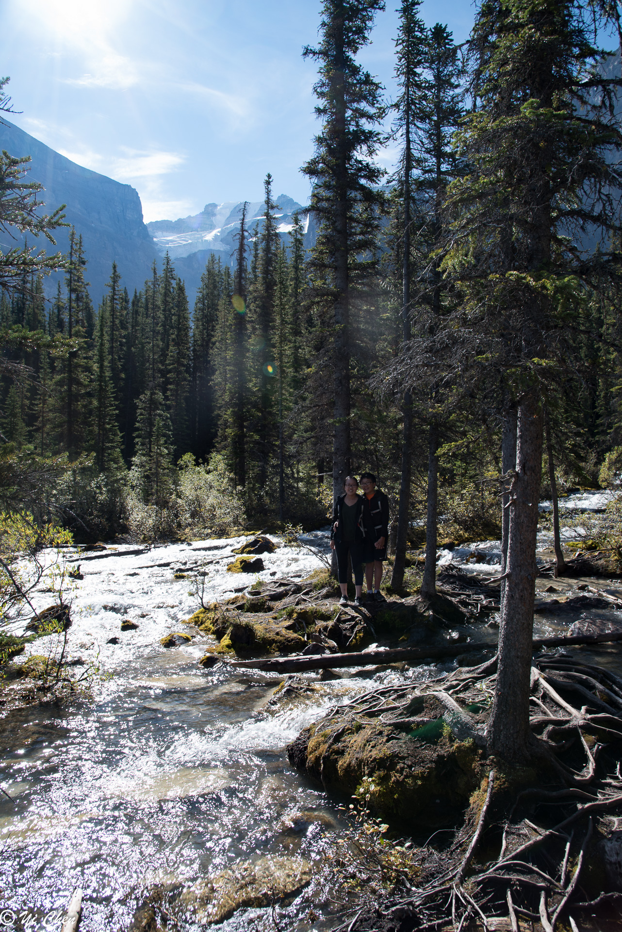 One can never see enough of the lake, it seemed every minute it had a new look. Nonetheless, we had to move on. The trail from Lodge to inlet on the west shore of the lake was a very easy stroll, and it offered many different views of the lake. There were areas we could get to the water, there were also plenty of rocks and logs to sit on and watch the lake’s ever changing beauty and the rugged summits of the first 5 of the Ten Peaks. Peak #1 was the most impressive, with its summit glacier.