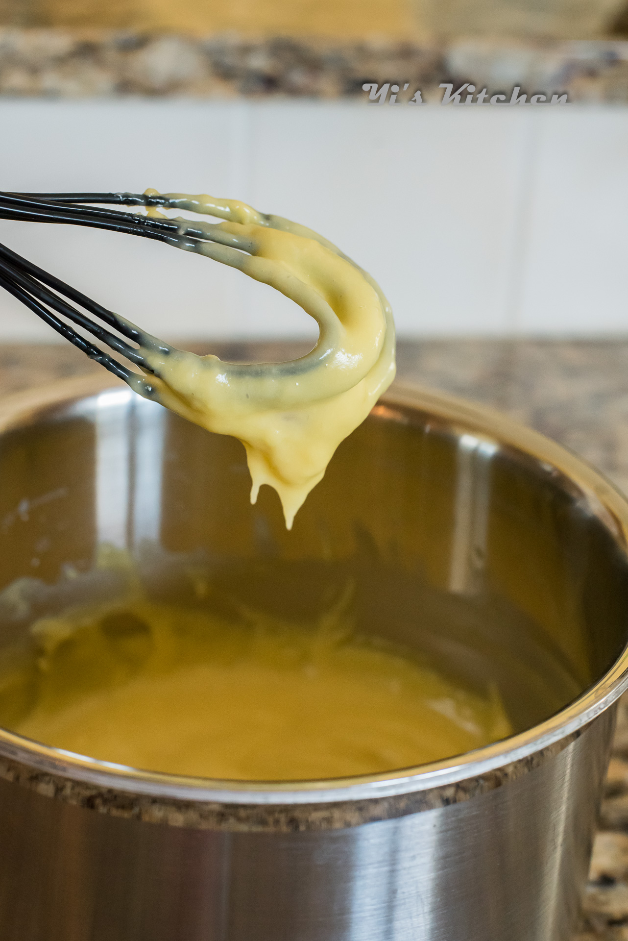 - 取一大碗放在开水上,倒入面粉,牛奶,搅拌至面糊状,加蛋黄,一个一个地加,每加一个蛋黄都要搅拌均匀,蛋黄奶糊在热水上一直搅拌至蛋黄酱的状态;离火,加入巧克力使其融化