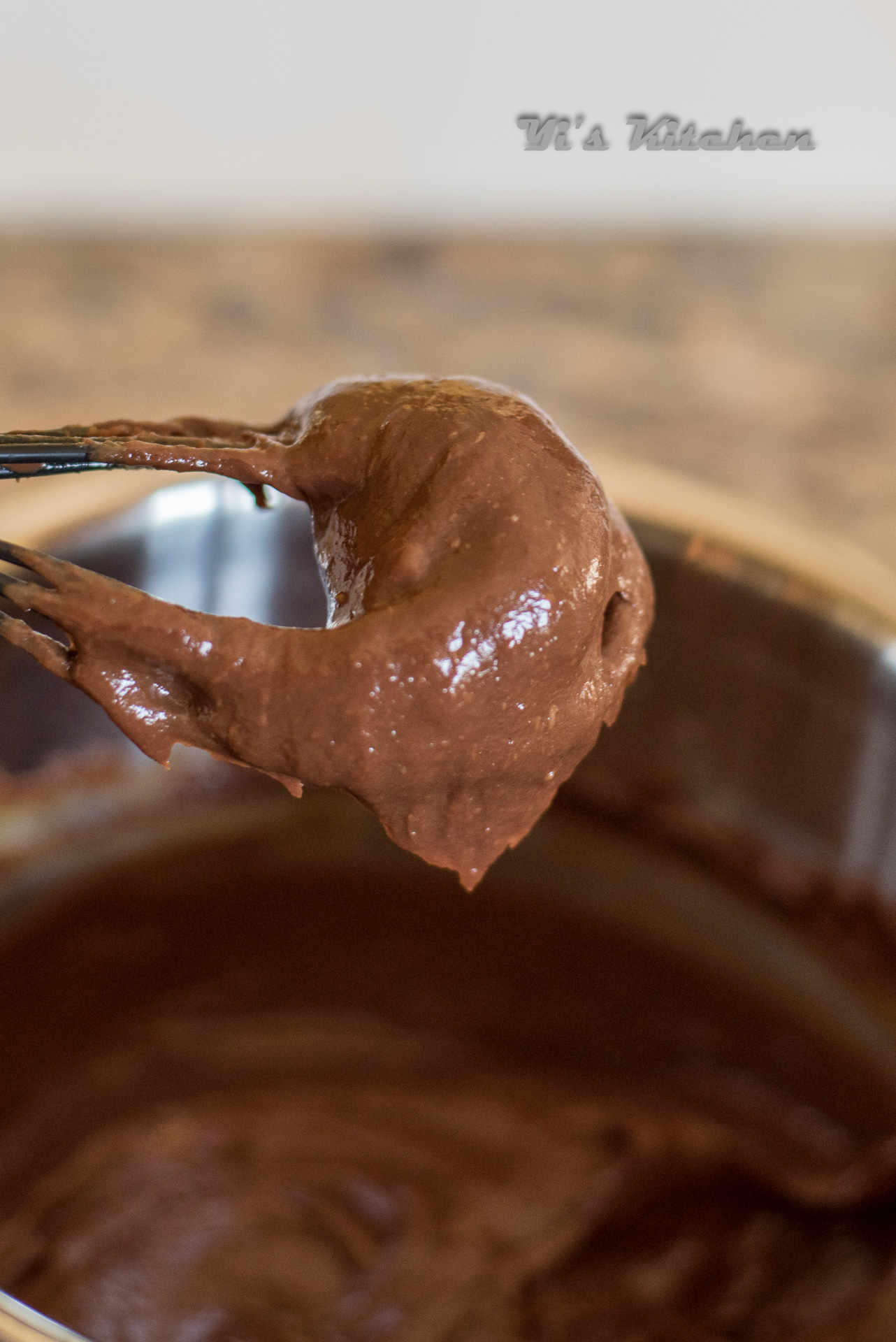 - 烧一锅开水,置中火上,上面放一个碗,熔岩料除巧克力以外都放碗里,搅拌至全部融化,离火,倒入巧克力