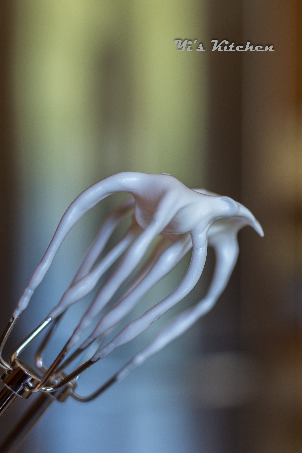 - 用手动搅拌器将蛋白和塔塔粉打至白色,分几次加糖,一直打发到有软尖尖
