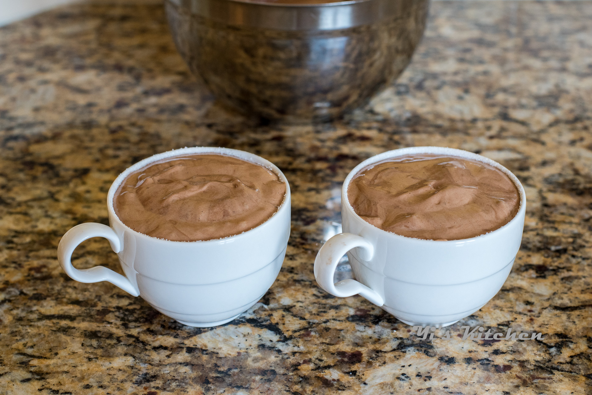 - 杯子底舀一勺舒芙蕾面糊,挖一小球凝固的熔岩,再倒入面糊直到杯口