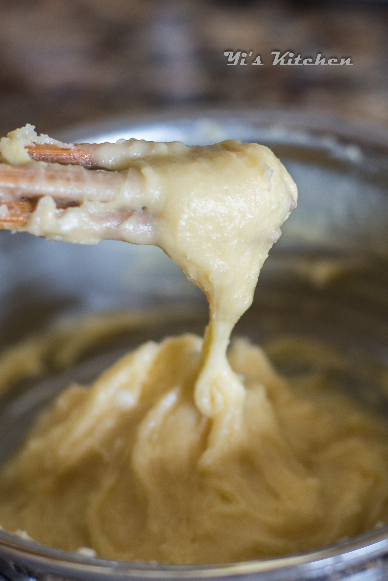 - 等面团降温到不烫手时,加入鸡蛋,每次加入一个,完全搅拌均匀再加下一个鸡蛋,直到面团湿润细腻