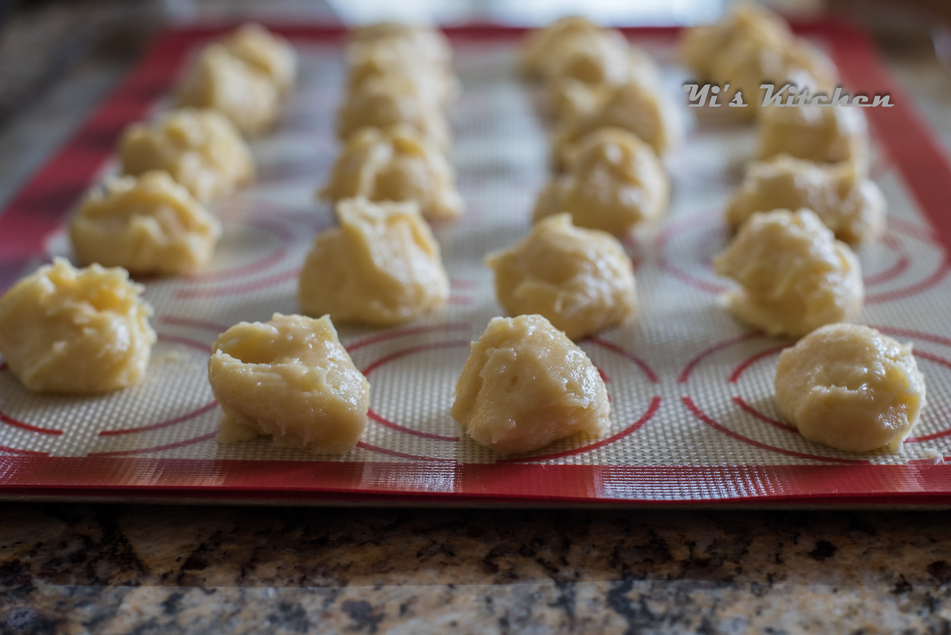 - 在硅胶垫上用两个勺,或者裱花袋挤24个圆球